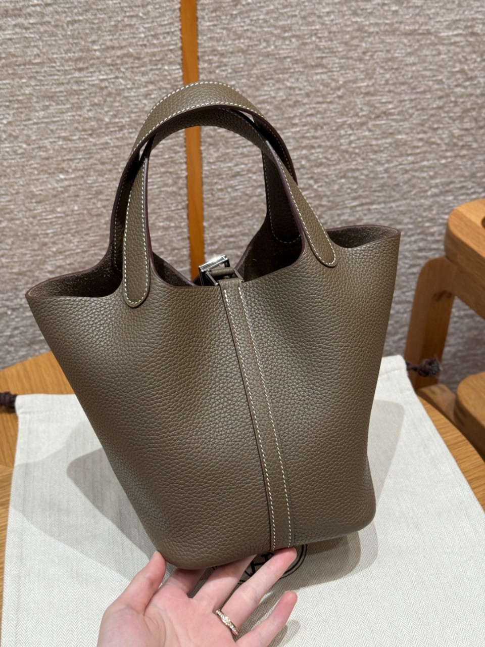 에르메스 피코탄 락 18 에토프 클레망스 실버(찡댄)Hermès Picotin Lock 18 EtoupeClemence Leather / Silver Hardware스팟상품 (즉시출고 가능)에르메스 데일리백 중에서가장 사랑받는 모델 1순위 피코탄 락 18 입니다.피코탄은 가볍게 툭 들었을 때자연스럽게 잡히는 쉐입이 정말 예쁘고,수납이 넉넉해서 데일리로 실사용 만족도가 아주 높은 라인입니다.이번 컬러 에토프(Etoupe) 는브라운+그레이가 섞인 고급 중성톤으로코디가 정말 쉬워서 사계절 내내 가장 인기 많은 컬러예요.또한 클레망스(Clemence) 가죽 특유의부드럽고 고급스러운 결감이 살아있어들수록 더 멋이 깊어지는 타입입니다.---제품 포인트제품명: 에르메스 피코탄 락 18컬러: 18 Etoupe (에토프)가죽: Clemence (프랑스 수입 클레망스 가죽)하드웨어: 실버특징: 자연스러운 쉐입 / 탄탄한 내구성 / 데일리 최강 활용도---사이즈18 × 13 × 18 cm---판매가문의 (만원 단위 안내)---피코탄 락 18 에토프 실버 조합은한 번 들면 계속 찾게 되는데일리 끝판왕 컬러+모델 조합입니다?---제품문의 (아래 고정)카카오톡 오픈채팅 : https://open.kakao.com/o/sM3xvM2h