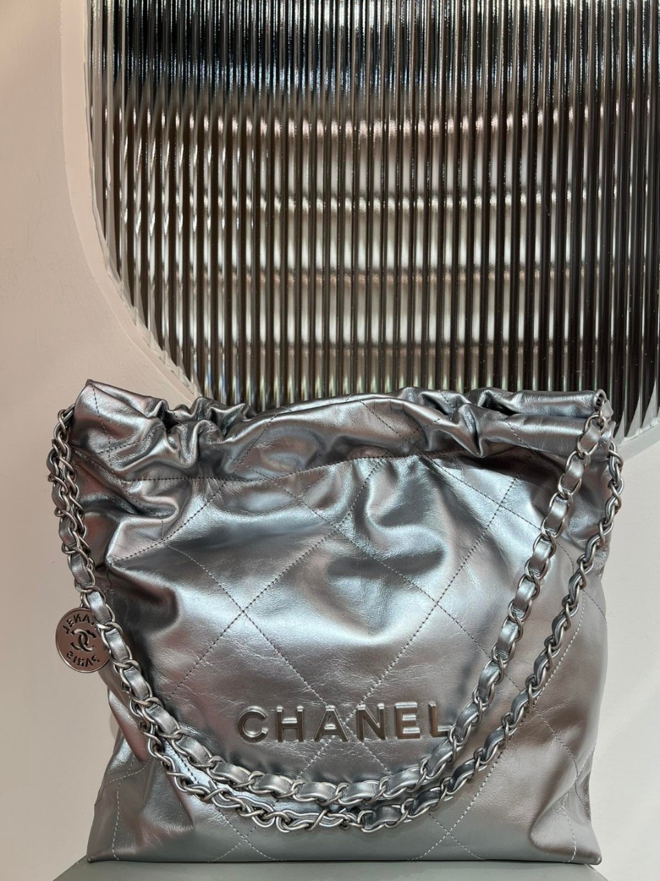 (지존샵) 샤넬 22 백 스몰 (Chanel 22 Bag Small)메탈릭한 컬러감이 돋보이는 샤넬 22 백 스몰 사이즈로, 트렌디하면서도 샤넬 특유의 고급스러움을 동시에 담아낸 모델입니다.---제품 포인트최상급 소가죽 사용으로 은은하게 살아있는 메탈릭 광택안팎으로 자연스럽게 비치는 유연한 가죽 질감과 부드러운 터치감체인 스트랩과 로고 디테일이 조화를 이루는 실버 톤 하드웨어가볍고 컴팩트한 사이즈로 포인트 백으로 최적화---소재소가죽 (Calfskin)컬러 / 하드웨어스페이스 실버 / 실버 톤사이즈가로 35 × 세로 37 × 폭 7 cm(스몰 사이즈)---스타일 제안심플한 룩에 매치해 강렬한 포인트 연출블랙·화이트 계열 코디와 매치 시 메탈릭 감성 극대화데일리부터 트렌디한 외출룩까지 폭넓게 활용 가능---