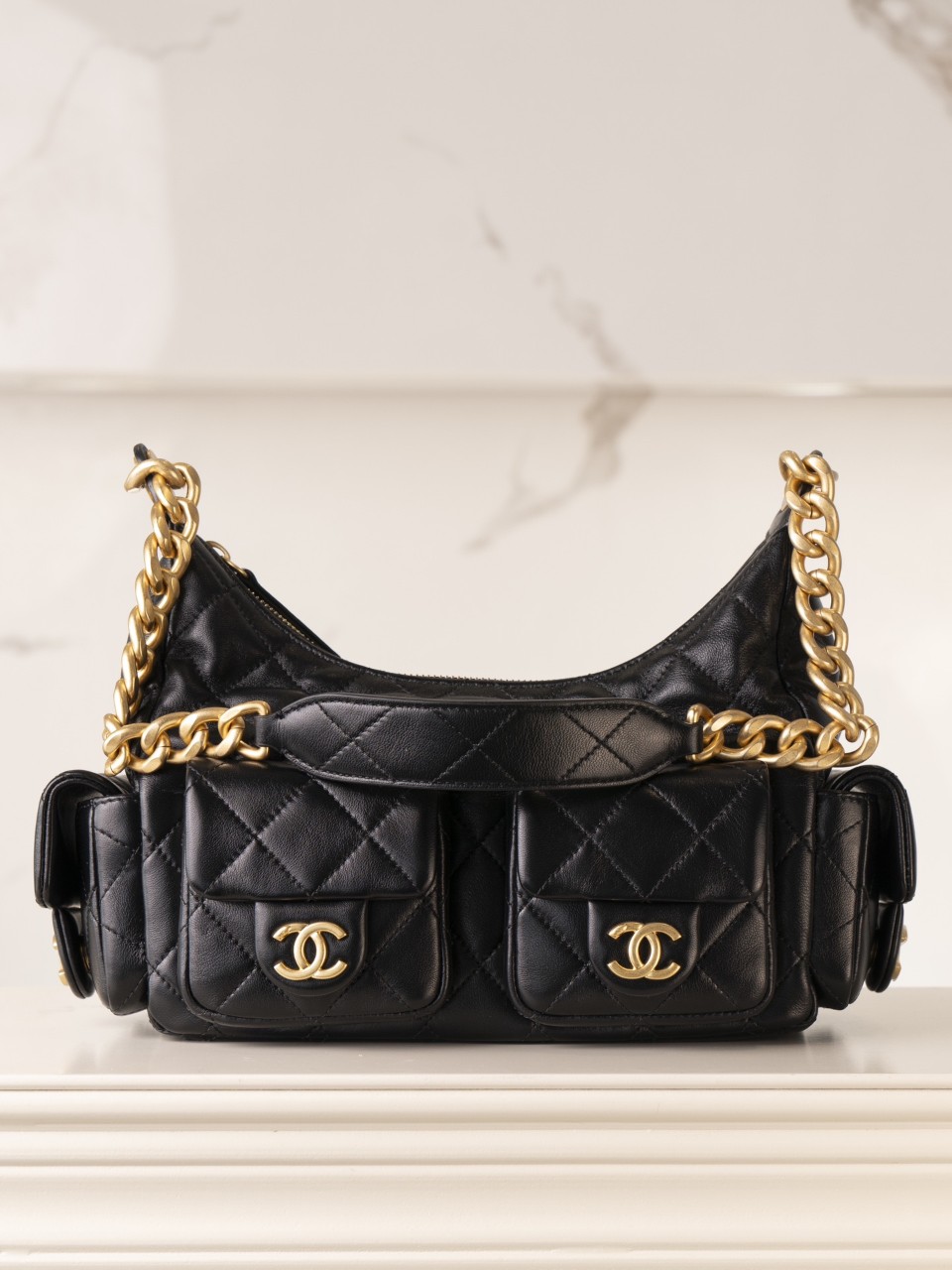 Chanel 25C 호보백 블랙 골드 샤넬 25C 호보백 블랙 골드 · ZP공장 제품 샤넬 25C 호보백은 독창적인 디자인과 고급스러운 디테일이 돋보이는 아이템입니다. 부드러운 양가죽을 사용하여 은은한 광택감과 유연한 착용감을 자랑하며, 네 개의 포켓이 배치된 구조로 실용성을 극대화했습니다.