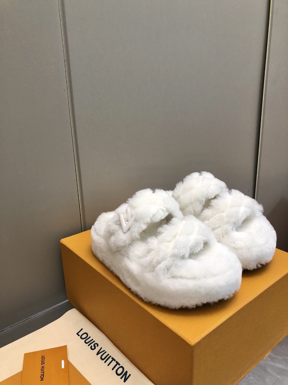 LV 로고 자수가 돋보이는 따뜻한 실내·외 겸용 퍼 슬리퍼입니다.