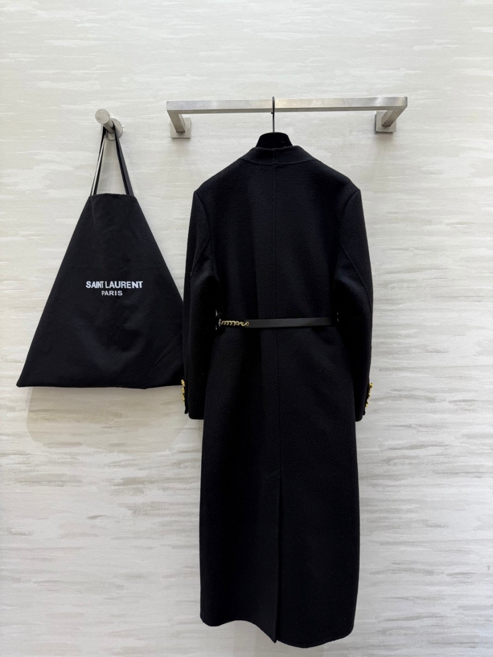 SAINT LAURENT 여성 울 더블 롱 코트 (블랙)생로랑 특유의 절제된 우아함이 돋보이는 울 더블 롱 코트.부드러운 고급 울 소재를 사용해 가볍지만 보온성이 뛰어나며,가을·겨울 시즌 데일리부터 포멀한 자리까지 폭넓게 활용 가능합니다.더블 브레스티드 구조와 블랙 메탈 체인 벨트 디테일이허리 라인을 자연스럽게 잡아주어 전체 실루엣을 더욱 슬림하게 연출합니다.A라인으로 떨어지는 균형 잡힌 핏과 골드 버튼 마감까지세부 완성도가 매우 높은 프리미엄 제품입니다.ZP급 고품질 맞춤 제작으로 완성된 압구정 퀄리티 라인.---사이즈S / M / L(M 사이즈 기준)어깨 41cm가슴 100cm총장 117cm