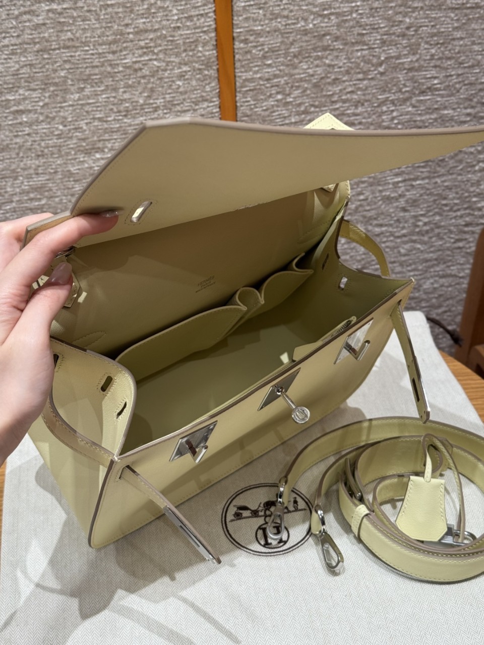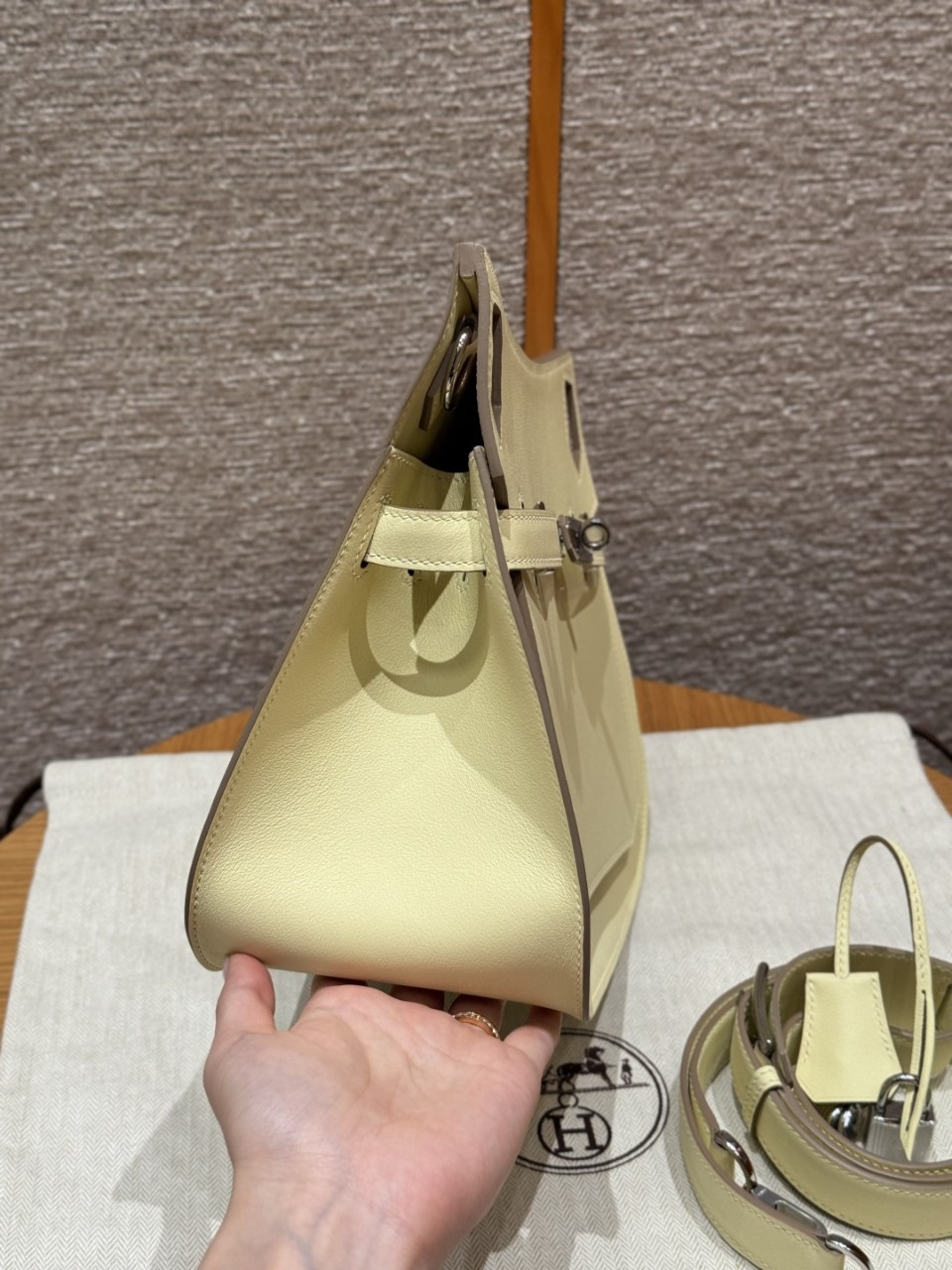 에르메스 클래식 Jypsiere 28 크로스백 Swift calfskin 특유의 부드럽고 은은한 광택감 컬러: Jaune Milto (i8) – 산뜻하면서도 세련된 옐로우 톤