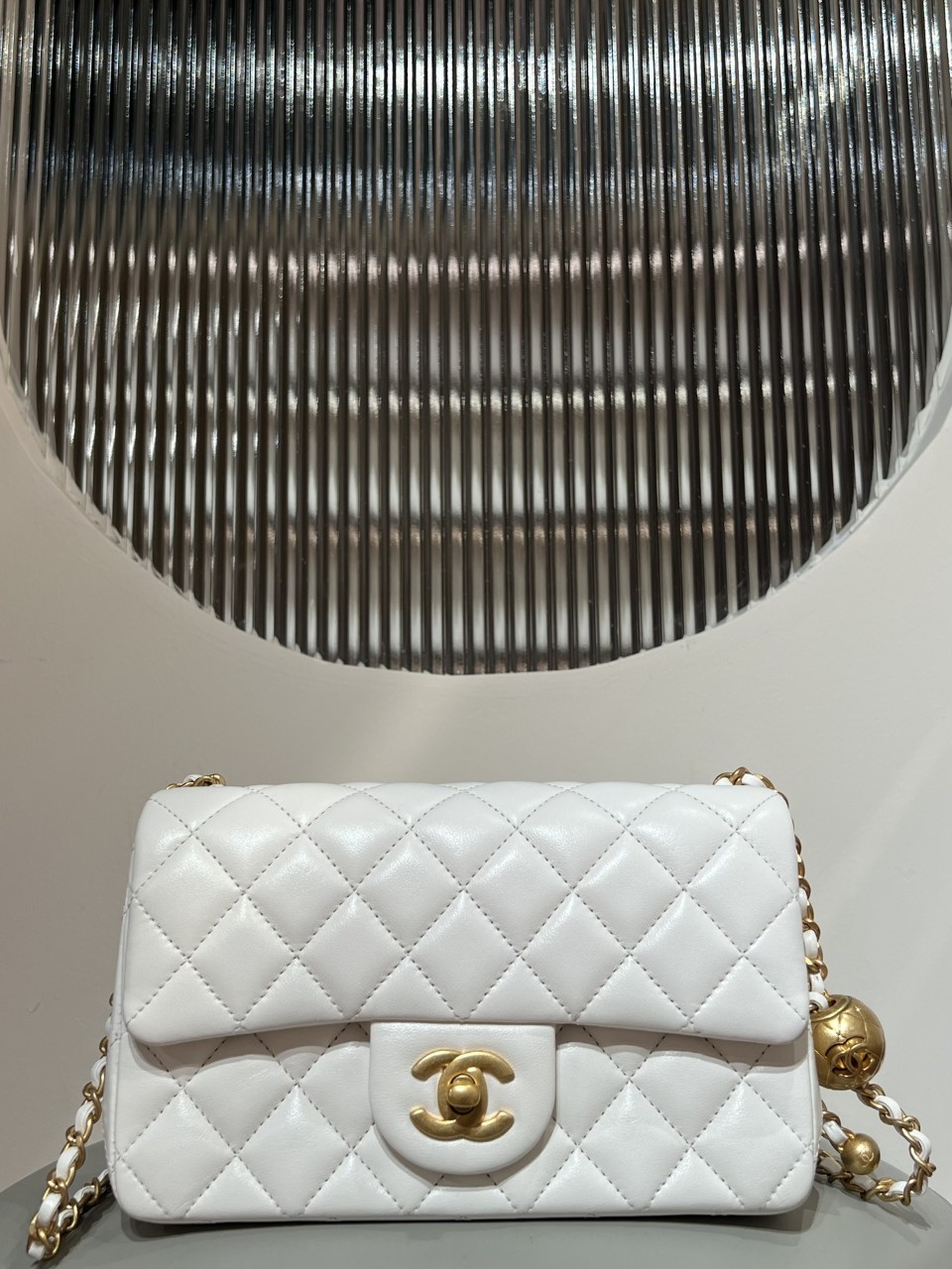 (지존샵) 샤넬 클래식 골드볼 미니 플랩 백(Chanel Classic Gold Ball Mini Flap Bag)클래식 퀼팅 패턴과 CC 턴락이 조화를 이루는 미니 플랩 백으로,체인 스트랩에 연결된 골드 볼 참이 디자인 포인트인 모델입니다.골드 볼 참을 통해 체인 스트랩 길이 조절이 가능해 착용 연출에 유연함을 더합니다.---✔ 제품 정보모델명: 샤넬 클래식 골드볼 미니 플랩 백(Chanel Classic Gold Ball Mini Flap Bag)소재: 램스킨 (Lambskin)색상: 화이트하드웨어: 골드 톤 (금구)특징:체인 스트랩 길이 조절 가능한 골드 볼 참클래식 퀼팅 패턴CC 턴락 클로저체인 스트랩 구성---