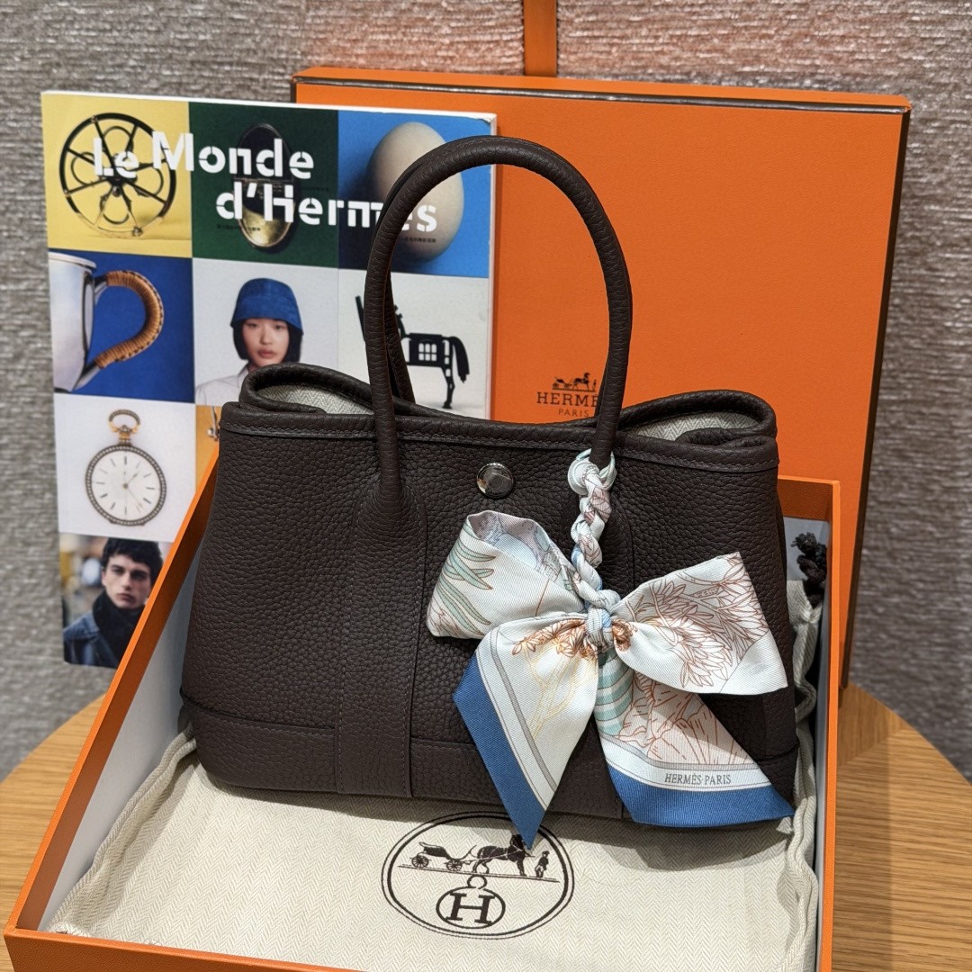 HERMÈS GARDEN PARTY 23에르메스 가든파티 23 에벤느(다크브라운)네곤다 카프스킨 / 실버 하드웨어 / 올수공 제작에르메스의 클래식 데일리 토트백 Garden Party 23.차분하고 깊이 있는 에벤느(다크 브라운) 컬러에네곤다 카프스킨 특유의 탄탄한 질감이 더해져오래 들어도 질리지 않는 에르메스 대표 데일리백입니다.---✅ 제품 포인트미니멀하면서도 실용적인 가든파티 시그니처 디자인단단한 구조감으로 형태 유지력 우수데일리 소지품 수납에 충분한 23 사이즈캐주얼 / 세미 포멀까지 폭넓은 활용도남녀공용으로 사용 가능한 클래식 토트백---✅ 소재네곤다 카프스킨 (Negonda Calfskin)프랑스 수입 카프스킨탄탄한 그레인과 뛰어난 내구성, 스크래치에 강한 가죽---✅ 컬러 / 하드웨어컬러 : 에벤느 (다크 브라운)하드웨어 : 실버---✅ 사이즈23 × 16 × 10 cm---✅ 제작 방식 (중요)100% 올수공(풀 핸드메이드) 제작재단, 봉제, 엣지 마감까지 전 공정 수작업가죽 결, 스티치 밀도, 마감 완성도에서 확실한 차이---