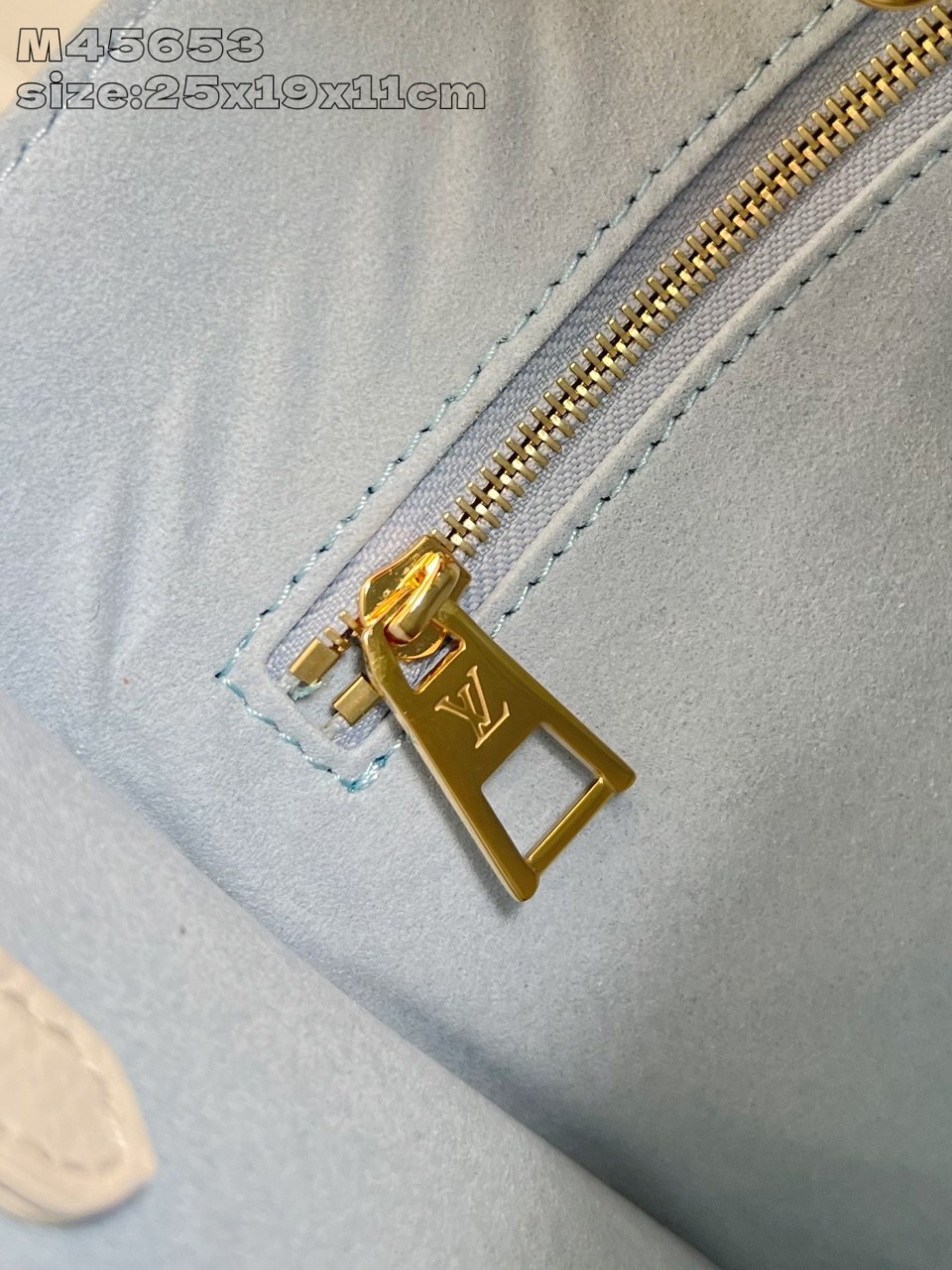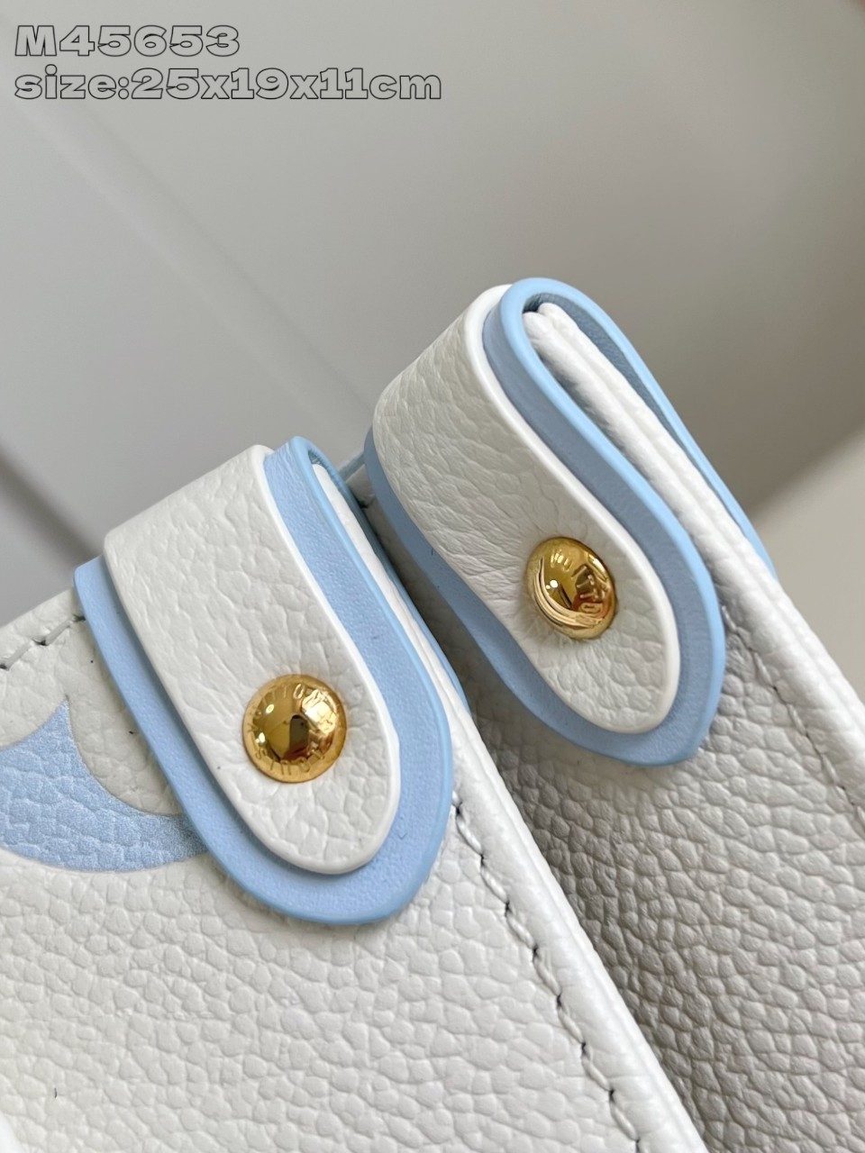 부드러운 모노그램 앙프렝뜨 가죽 위에 화이트&블루 실크스크린 프린트가 더해져