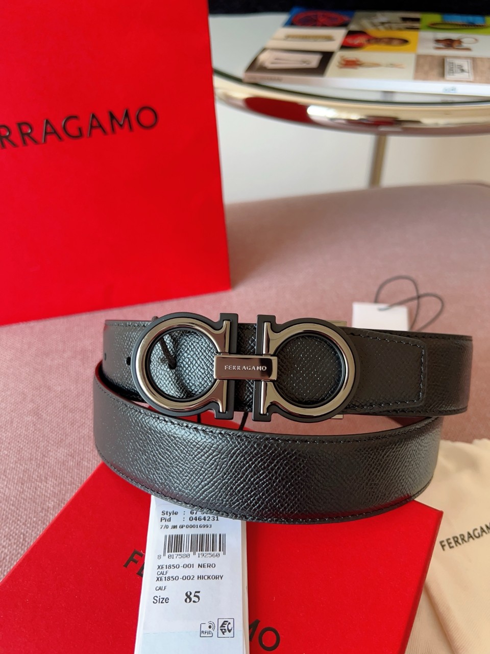 Ferragamo 페라가모 2025 간치니 실버 버클 블랙 가죽 벨트 (3.5cm)