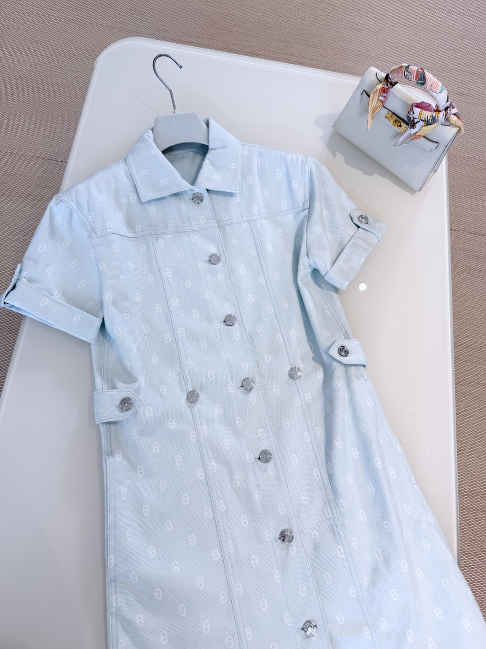 HERMES 에르메스 민트 블루 로고 버튼 원피스