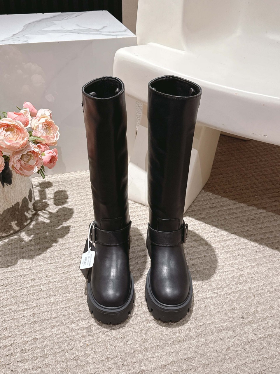 Prada 프라다 모노리스 트라이앵글 로고 니하이 부츠 – 블랙