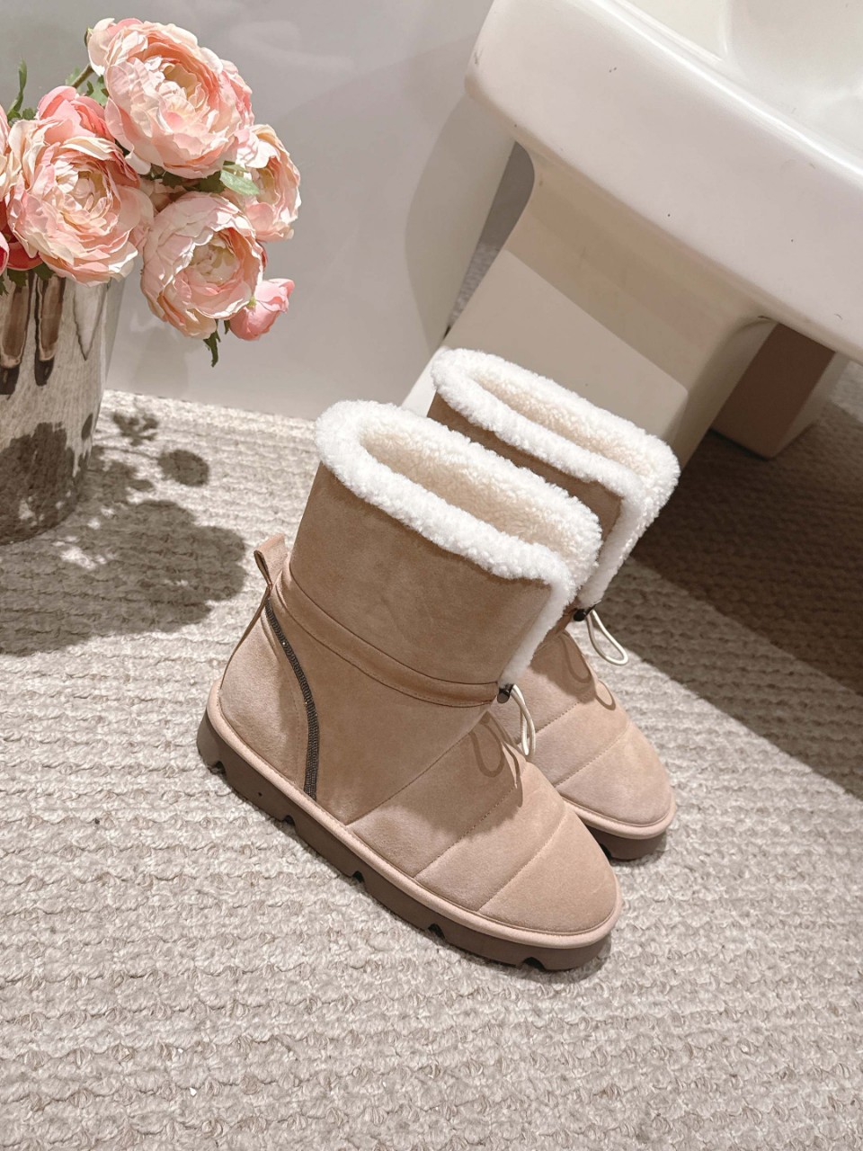 Brunello Cucinelli Shearling Lined Suede Snow Boots브루넬로 쿠치넬리 시어링 스웨이드 부츠 -아이보리 ---■ 제품 특징. Brunello Cucinelli FW 시즌 라인의 시그니처 스노우 부츠. 최고급 천연 시어링(양털) 소재로 부드럽고 포근한 착용감 제공. 외피는 고급 스웨이드 가죽으로 제작되어 내추럴하면서도 우아한 질감 표현. 부츠 안쪽 전체를 퍼로 덮어 뛰어난 보온성과 통기성 동시 구현. 1:1 오리지널 비율과 몰드로 재현된 프리미엄 퀄리티. 편안한 착용감과 고급스러운 라인을 모두 갖춘 윈터 필수 아이템---■ 소재겉감: 천연 시어링(양털)내피: 고급 가죽 및 퍼아웃솔: 논슬립 러버 솔---■ 사이즈Size: 35~42 (40·41·42 주문제작, 교환불가)---브루넬로 쿠치넬리의 장인정신이 담긴 시그니처 부츠.따뜻함과 품격을 동시에 전하는 고급 윈터 컬렉션으로,한층 격조 있는 겨울 스타일을 완성합니다.