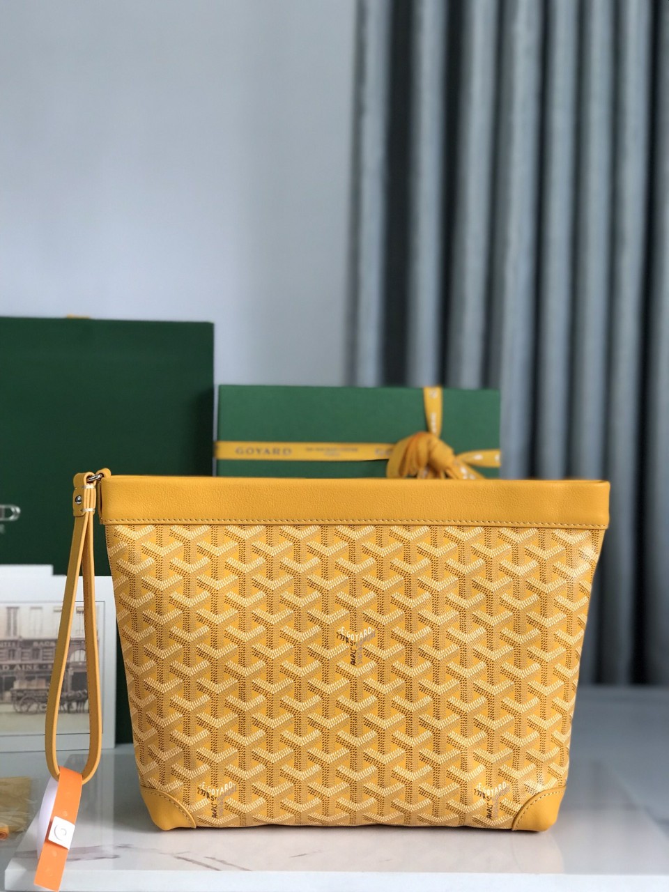 고야드 콘티 파우치– 옐로우 ---■ 제품 특징. Goyard의 상징적인 Chevron 패턴이 돋보이는 Conti Pochette 시리즈. 부드러운 소가죽과 코팅 캔버스로 제작되어 내구성과 세련미를 동시에 갖춤. 탈착 가능한 손목 스트랩 포함으로 클러치, 손목가방 등 다양한 연출 가능. 내부는 부드러운 스웨이드 라이닝으로 고급스러운 질감 유지. 간단한 소지품을 담기 좋은 컴팩트한 구조로 실용성 탁월. 파우치 단독 사용은 물론, 대형 가방 내부 수납용으로도 활용 가능. Goyard 특유의 정제된 라인감과 도시적인 감성이 조화된 디자인---■ 사이즈Size: 24 x 22 x 6.5 cm---심플하지만 존재감이 확실한 Goyard Conti Pochette.여성스러운 라인과 클래식한 감성으로, 어떤 스타일에도 고급스러운 포인트를 더해줍니다.