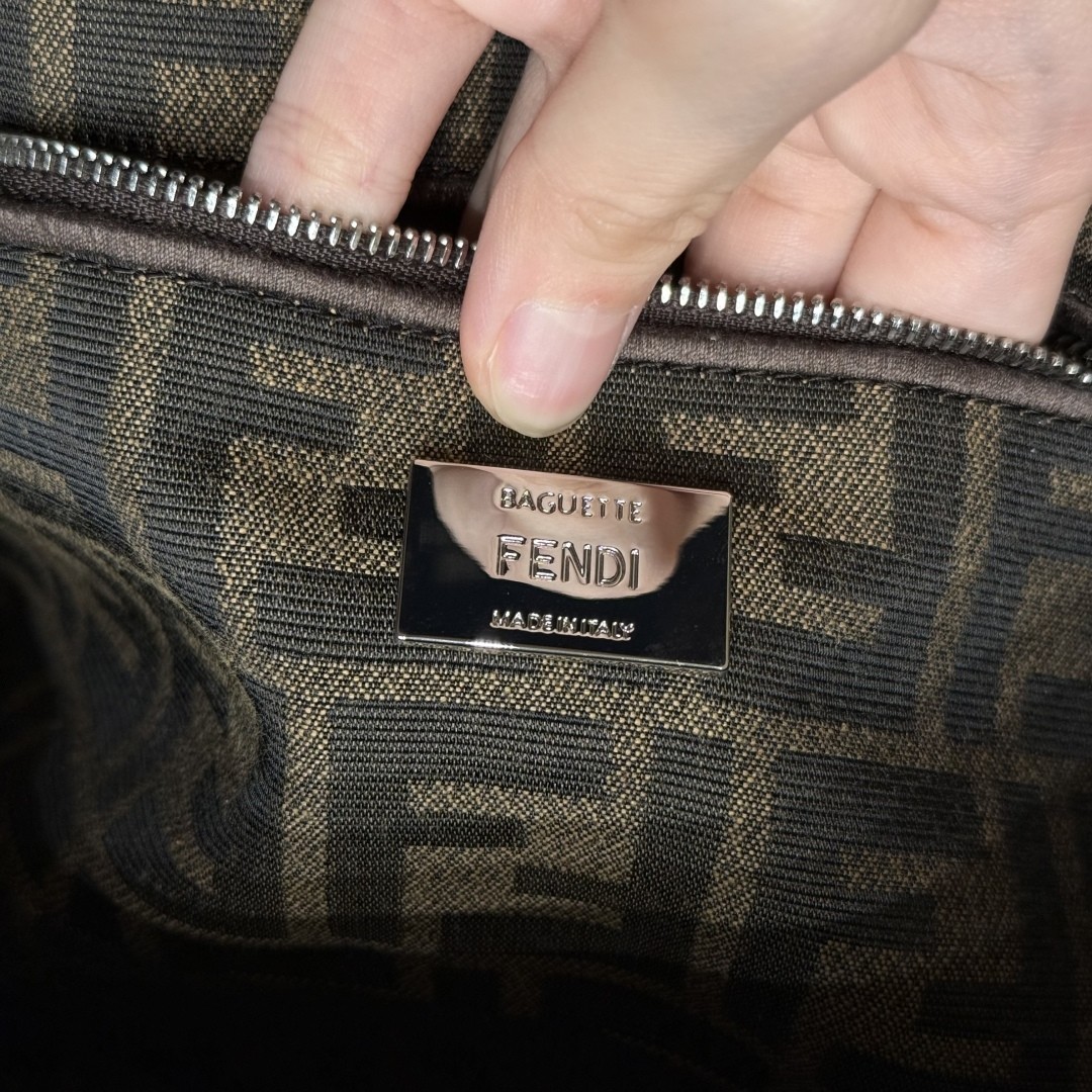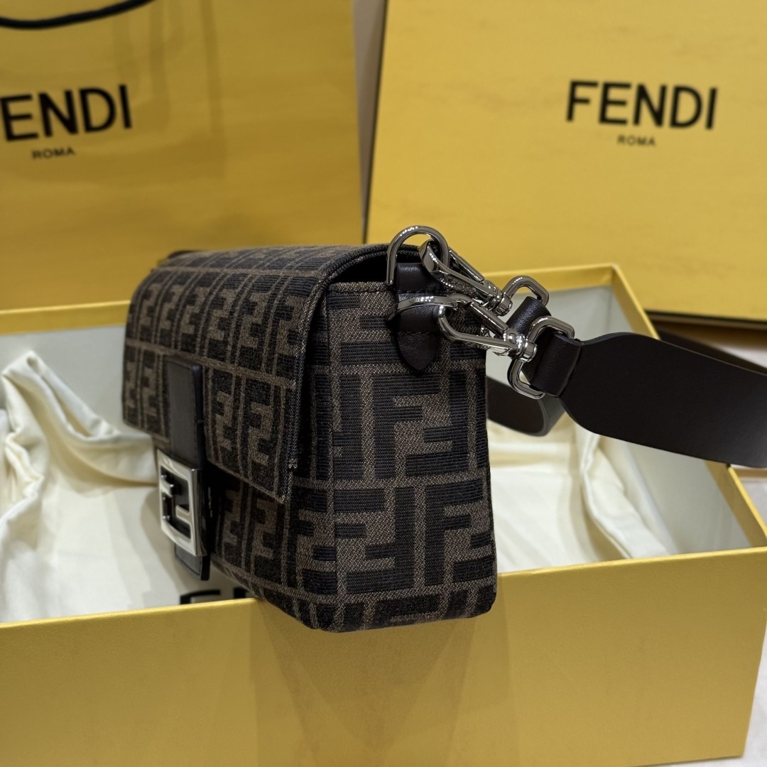 펜디의 아이코닉 Baguette 백, 뉴 버전 클래식한 FF 자카드 패브릭 로고 패턴 바디 깊은 브라운 톤 숄더 스트랩 포함 → 인지도를 높여주는 시그니처 디테일