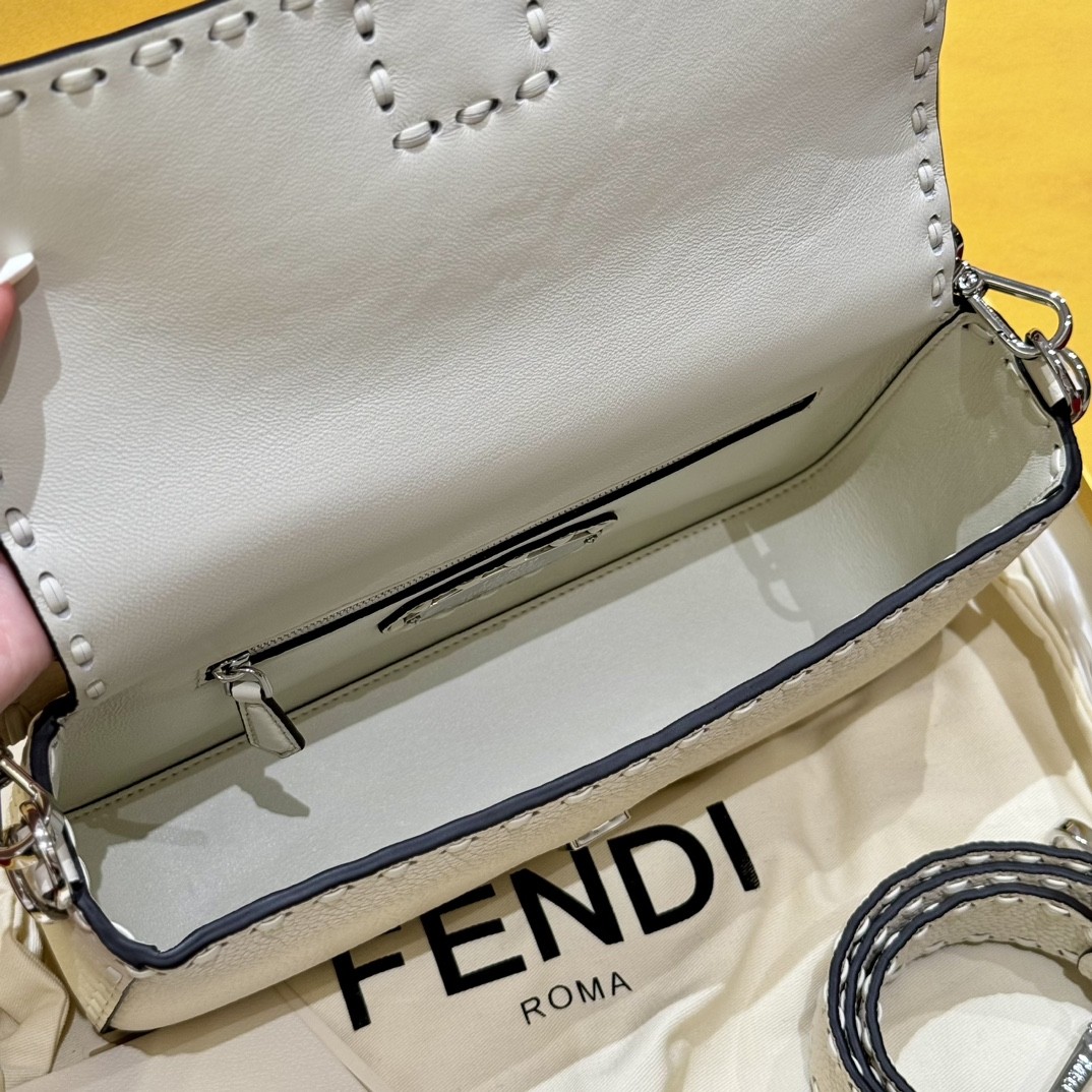 펜디의 시그니처 Baguette 백 고급 카프스킨 → 부드럽고 내구성 강하며 고급스러운 질감 컬러: 화이트 – 우아하고 세련된 감각