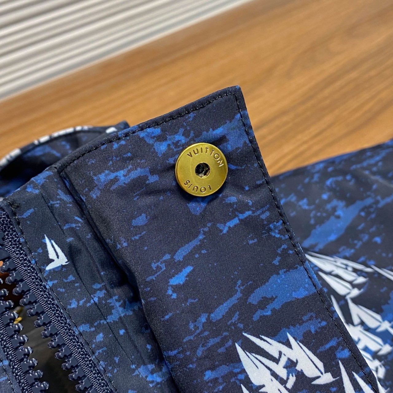 LV 로고 지퍼 헤드 & 가슴 고무 명판 → 절제된 럭셔리 포인트
