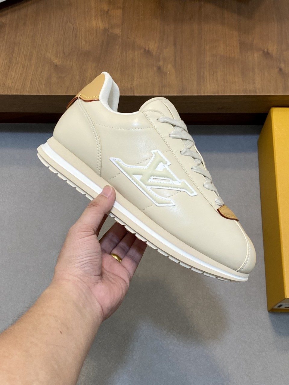 세련된 베이지 레더와 LV 로고 디테일의 조화, 단순함 속에서 고급스러운 품격을 느껴보세요.