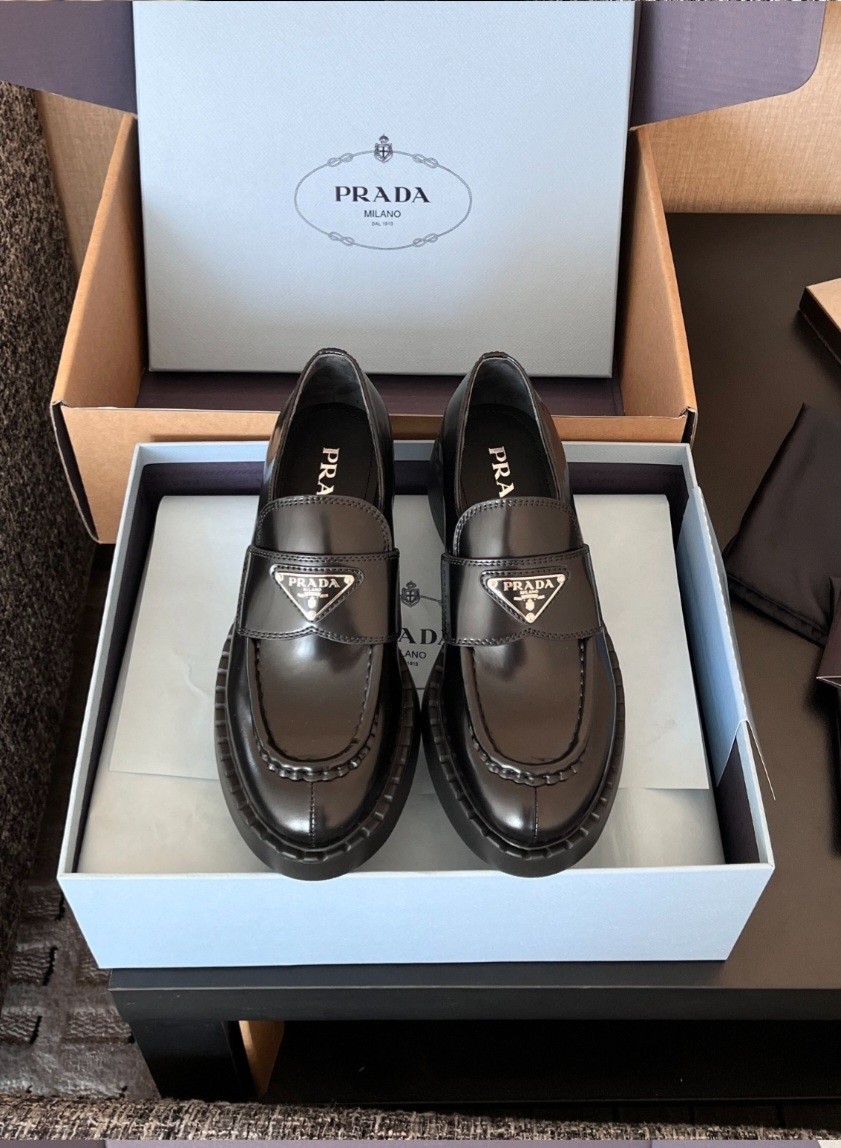· 국내 백화점 동일 스타일의 고급 브러시드 가죽 소재 · 프라다의 시그니처 트라이앵글 로고 장식 포인트 · 유행을 타지 않는 클래식 로퍼 실루엣