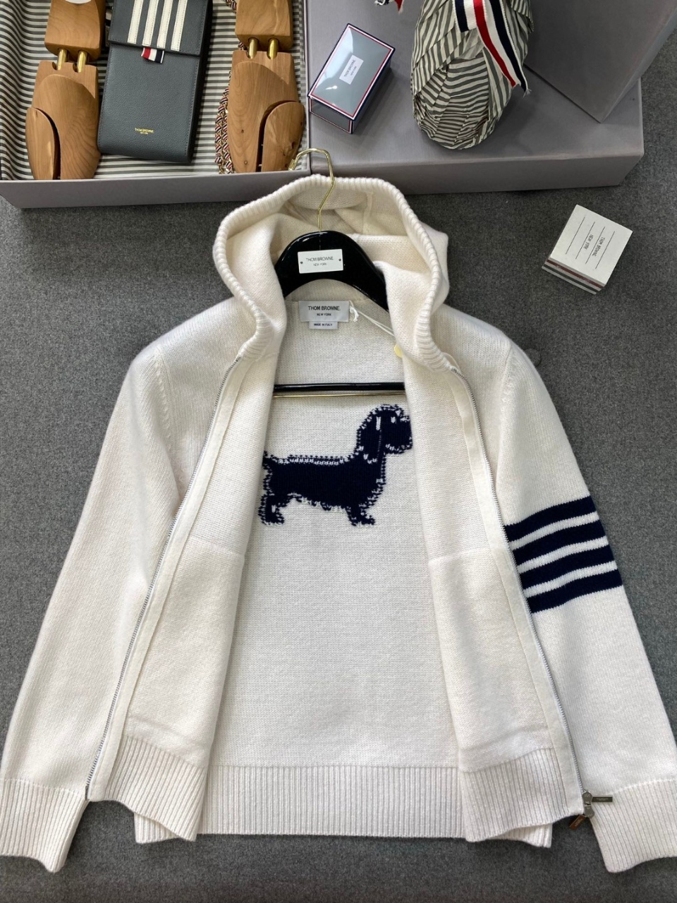 톰브라운 4바 울 니트 후드집업100% 울 소재로부드럽고 포근한 착용감과 뛰어난 보온성.시그니처 4바 스트라이프 디테일과백라인 도그 자수 포인트로브랜드 아이덴티티를 완성.탄탄한 니트 조직으로형태감 유지와 고급스러운 실루엣 연출.후드 + 집업 디자인으로캐주얼하면서도 세련된 스타일링 가능.사이즈1 / 2 / 3 / 4