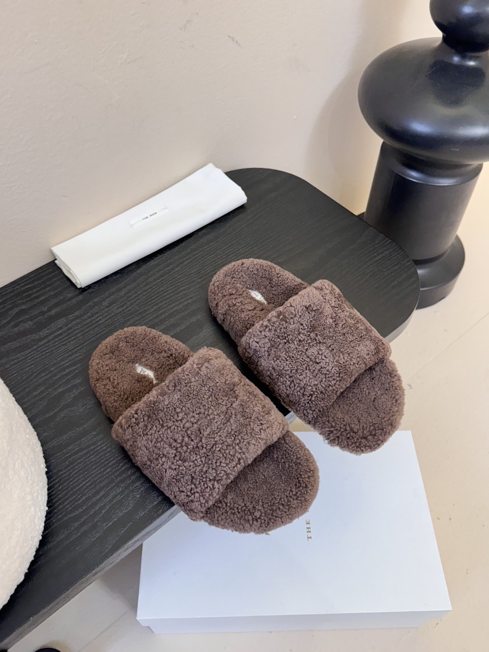 THE ROW 25S 양모 플랫 퍼 슬리퍼 (초코브라운)