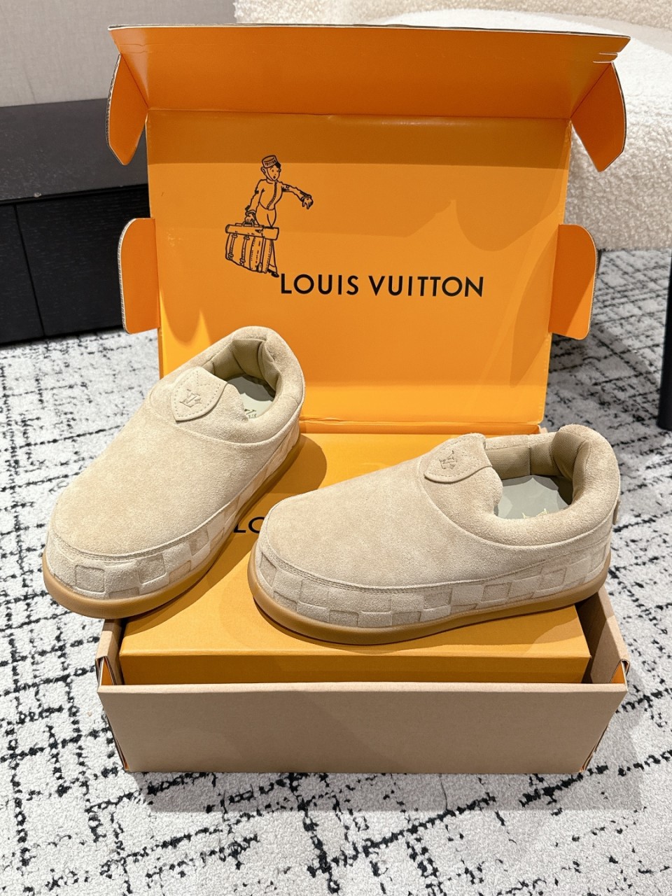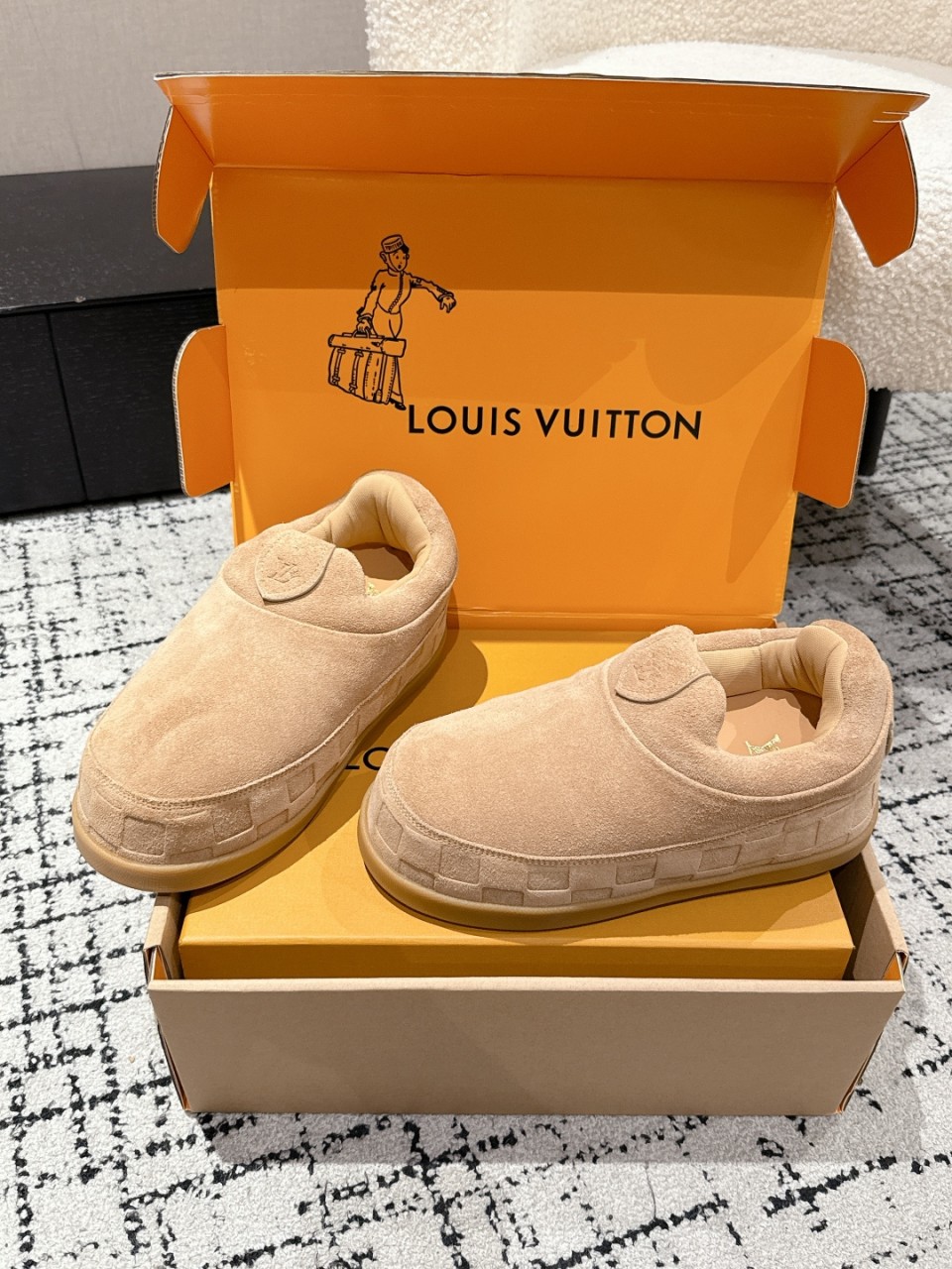 LV Yeti 시리즈의 최신작 → 세련된 겨울 시즌 한정판 디자인 겉감 : 프리미엄 수입 소가죽 → 고급스러운 질감과 내구성 안감 : 맞춤형 에어 메시 → 편안한 착용감과 통기성 제공 오리지널 몰드 오픈 논슬립 TPU 소재 → 미끄럼 방지 & 안정감 강화 아웃솔 : 5cm 두께 → 키 높이 효과와 안정적인 착화감