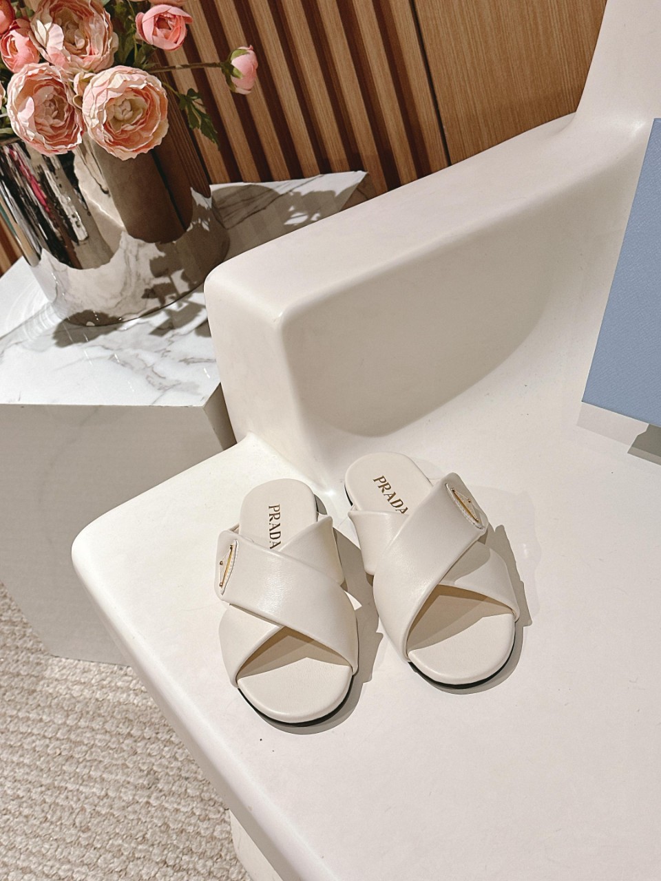 Prada 프라다 트라이앵글 로고 크로스 뮬 샌들- 화이트