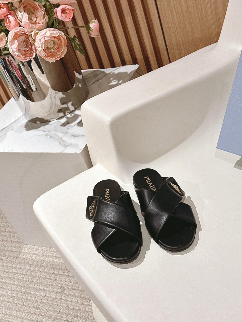 여름 시즌 가장 활용도 높은 프라다 크로스 뮬 샌들.