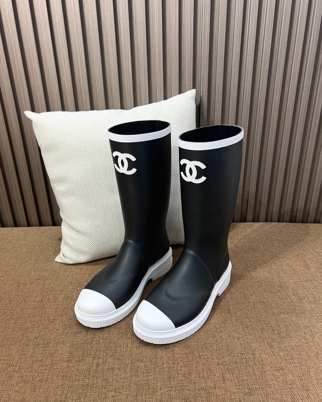 샤넬 크루즈 컬렉션 감성의 CC 로고 레인 부츠. 미들 기장 실루엣과 깔끔한 투톤 디자인이 어우러져 비 오는 날에도 스타일을 완성해주는 아이템입니다. 사이드에 더해진 더블 CC 로고 포인트로 심플하면서도 브랜드 아이덴티티를 확실히 보여줍니다.