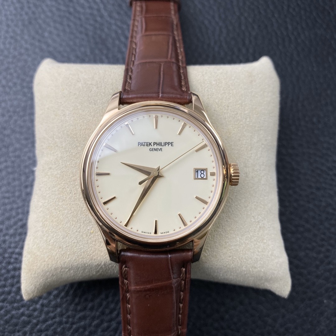 파텍필립의 아이코닉 드레스 워치 라인 Calatrava 심플하면서도 품격 있는 아이보리 톤 다이얼 & 골드 핸즈 6시 방향 날짜창 → 실용성과 균형감 있는 디자인 시그니처 히든 힌지 케이스백 → 오픈 시 무브먼트 감상 가능 브라운 가죽 스트랩 & 핀 버클 → 클래식한 포멀 감각 완성