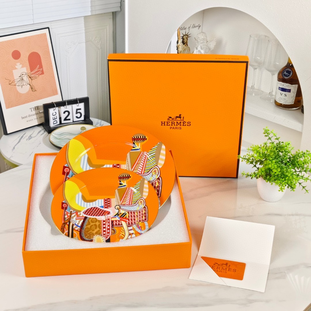HERMÈS플레이트 2종 세트 (오렌지 컬러 / 10인치 + 8인치 / 선물박스 포함)에르메스 특유의 감성과 예술적인 컬러감이 살아있는프리미엄 플레이트 2종 세트입니다.선명한 오렌지 톤과 시그니처 무드로테이블 위에 올리는 순간 분위기가 확 달라지는 아이템입니다.오렌지 박스 포함으로 선물용/소장용 모두 완벽한 구성입니다.---✅ 구성10인치 플레이트 1개8인치 플레이트 1개에르메스 선물박스 포함---✅ 사이즈[10인치 플레이트]지름 25.9cm / 높이 1.8cm[8인치 플레이트]지름 20.9cm / 높이 1.7cm[선물박스]박스 한 변 30.5cm / 높이 6.5cm무게: 1.3kg---✔️ 컬렉션급 존재감으로에르메스 감성 테이블을 완성해주는 플레이트 세트입니다.---