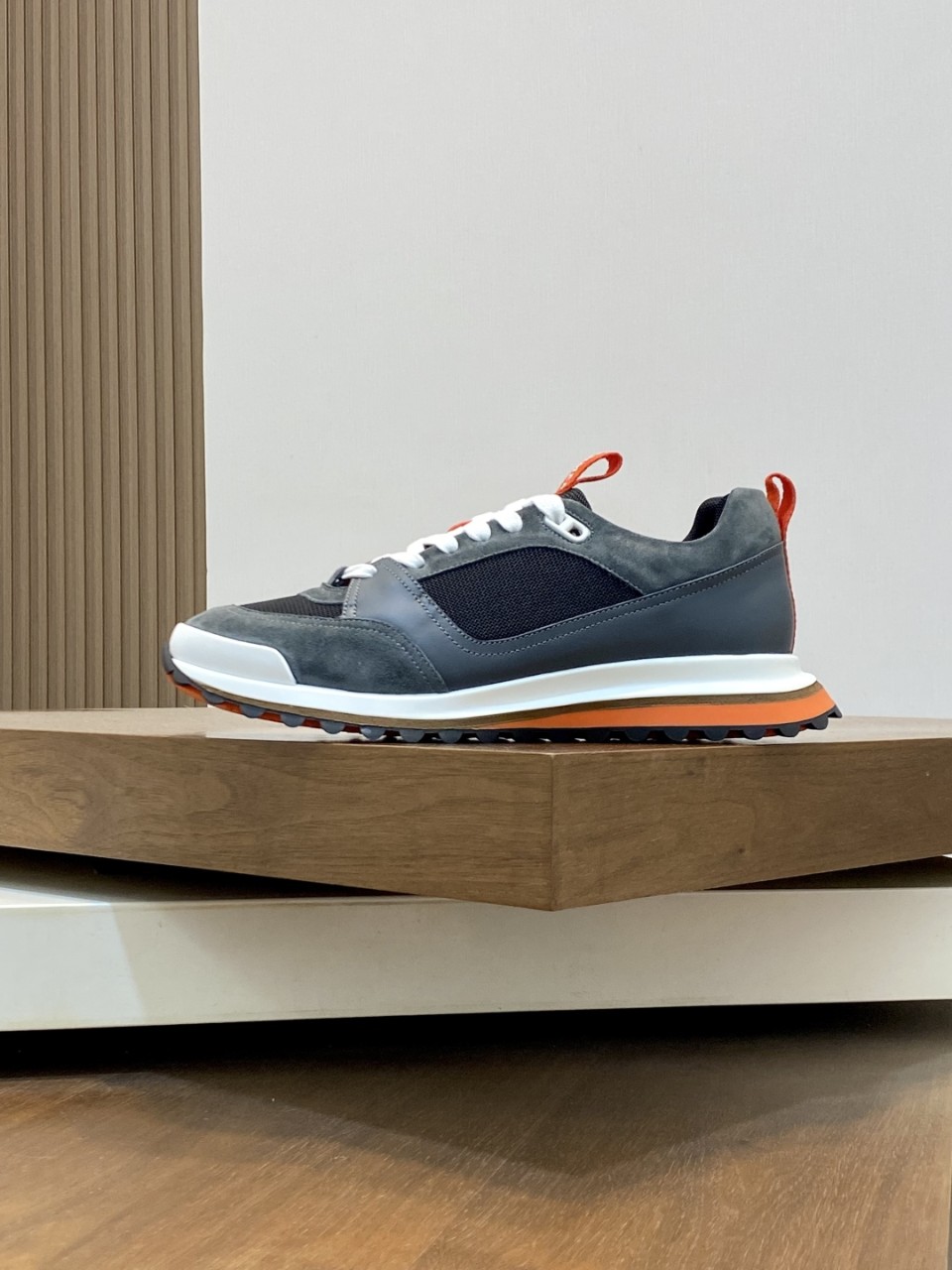 에르메스 리더 스니커즈 블랙&오렌지 포인트 에디션은 블랙의 모던함에 오렌지 디테일로 스포티한 감각을 더한 모델입니다.