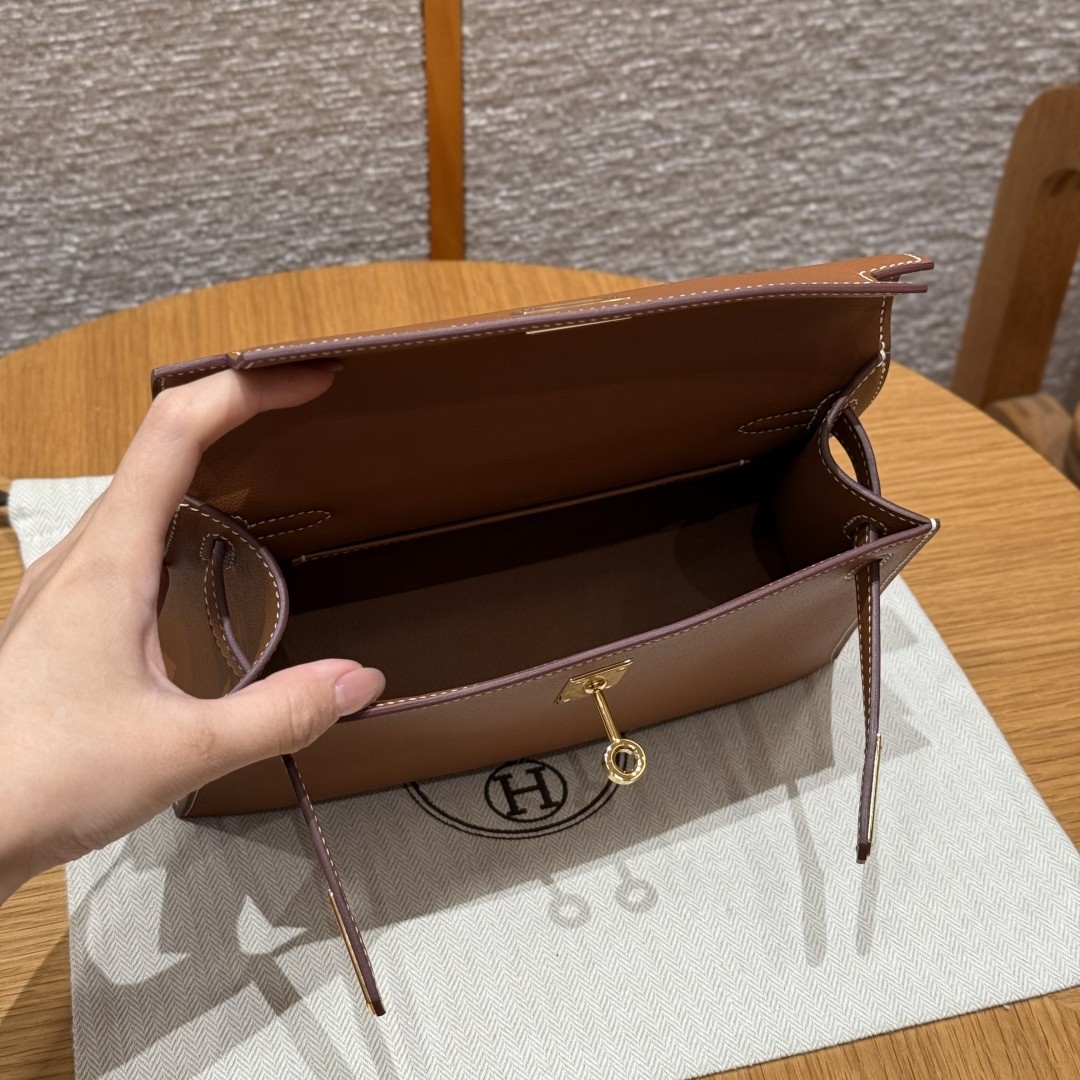 에르메스의 아이코닉 Kelly Pochette (켈리 포쉐트), 클래식한 Gold 컬러 + 금장 하드웨어 조합, 클러치 & 이브닝 백으로 활용도 높은 세련된 디자인
