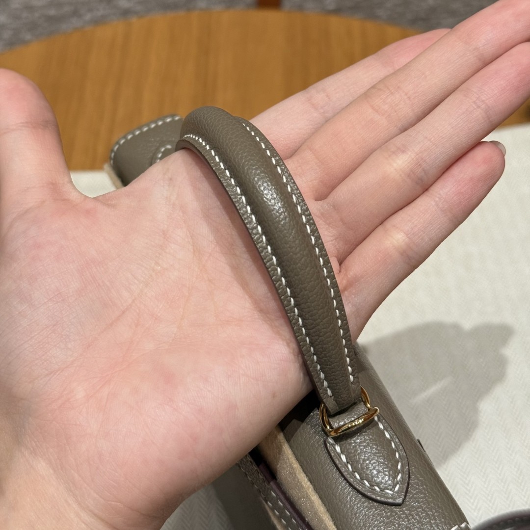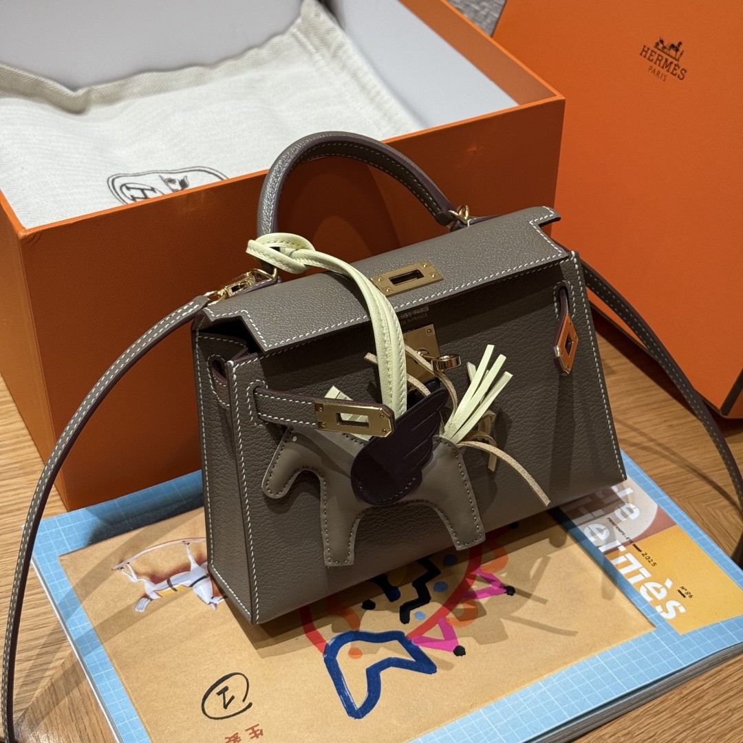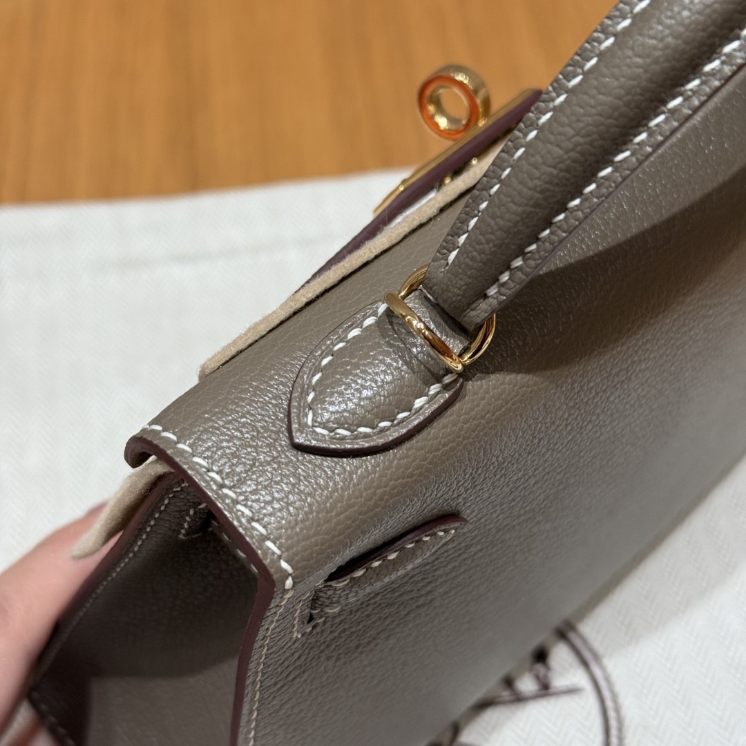 에르메스 대표 인기 컬러 Etoupe (에토프, 따뜻한 그레이 브라운톤) 골드 하드웨어와 어우러진 클래식하면서도 세련된 무드 작지만 강렬한 존재감과 우아함을 지닌 미니 Kelly