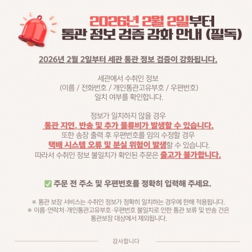 ✈️ 해외배송 안내 해외 상품 직접 구매 배송대행 신청서 작성 해외 현지 배송 무게 측정 후 배송비 결제 상품 수령 완료 국내 배송 시작 국내 통관 관부가세 납부 국내로 배송 출발 ☑️ 배송 메시지에 통관번호를 꼭 남겨주세요. ☑️ 카카오톡 채널에 성함 남겨주시면 검수 사진, 운송장 안내드립니다. 결제후 해외배송 포함 5~10일 이내에 상품을 받아 보실 수 있습니다. (제주도를 포함한 도서,산간지역은 항공료 또는 도선료가 추가됩니다.) 📦 배송 안내 해외 수입 제품 특성상, 박스에 약간의 훼손이 있을 수 있습니다. ⏰ 상품 수령 후 즉시 검수 필수 (배송 완료 후 24시간 이내 반드시 상품 상태 확인)