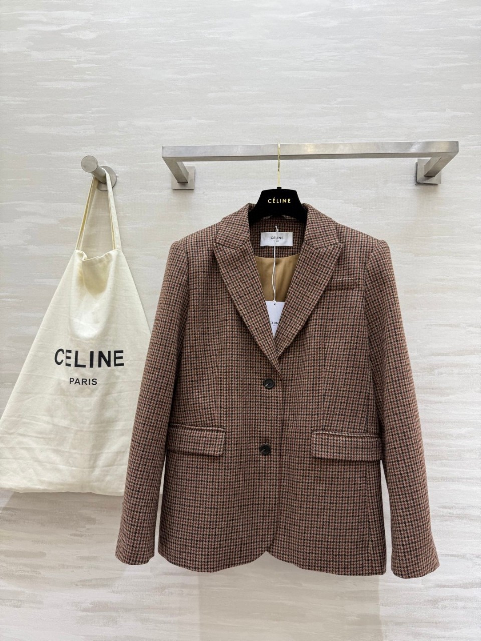 셀린느 특유의 클래식한 감성이 살아있는 빈티지 울 체크 자켓.