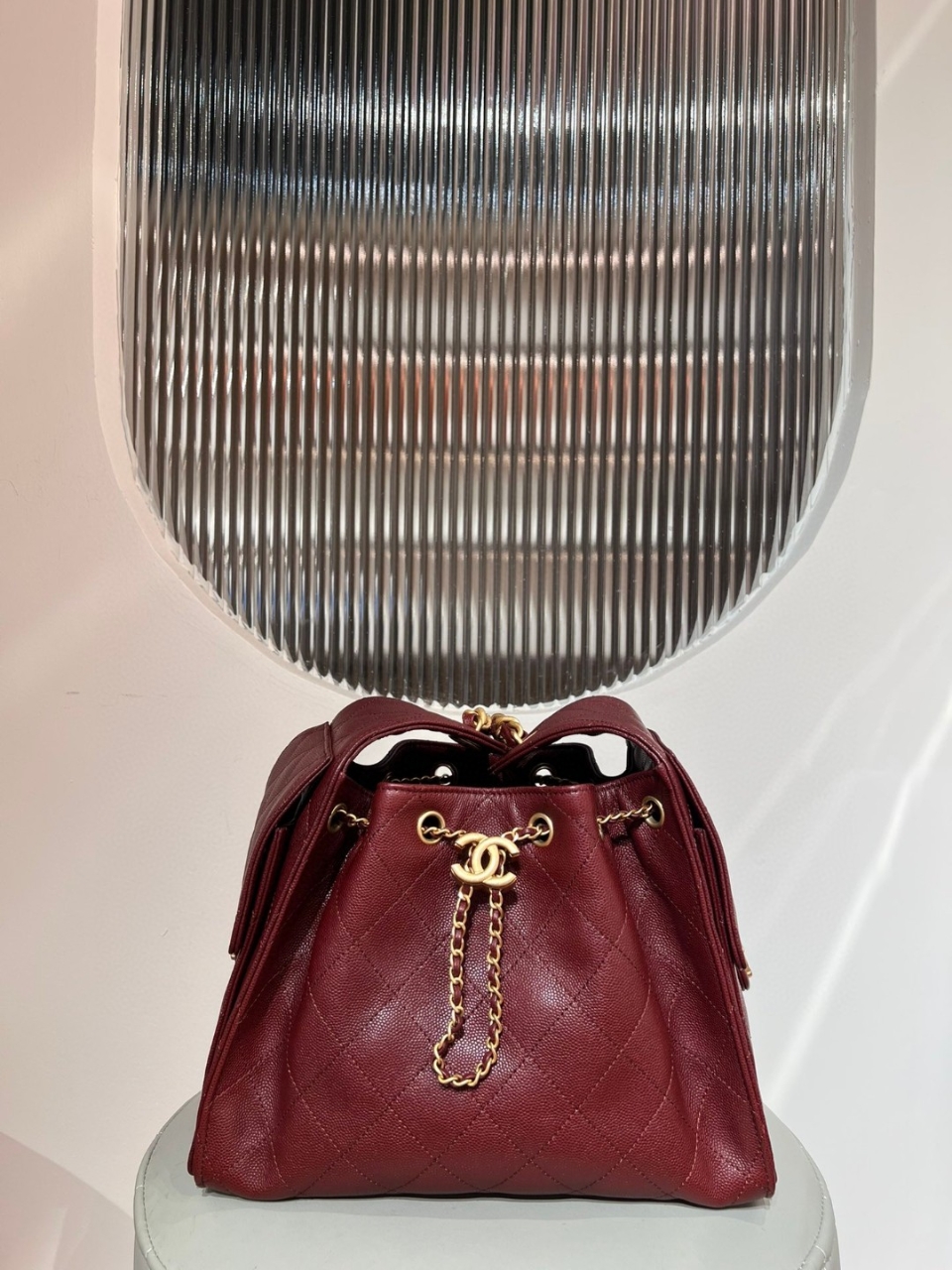 드로스트링 버킷 실루엣이 결합된 샤넬 25백 스몰 모델입니다.