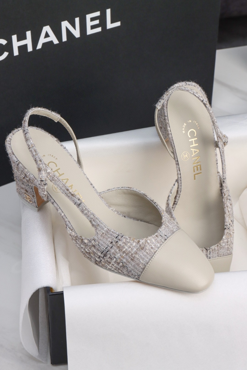 샤넬 시그니처 트위드 소재와 우아한 슬링백 디자인이 돋보이는 25B 시즌 힐입니다. 클래식한 투톤 분위기와 세련된 실루엣으로 데일리룩부터 모임·오피스룩까지 고급스럽게 스타일링하기 좋은 모델입니다.